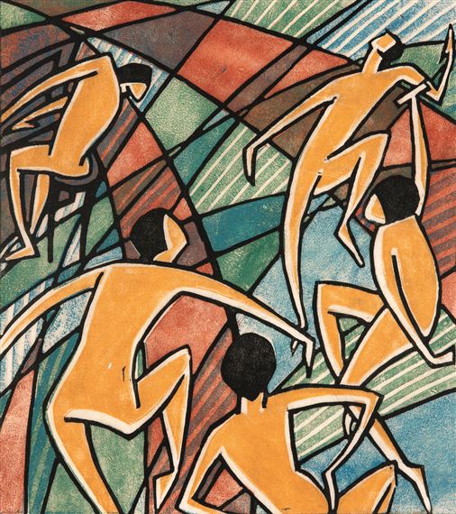 The British and American publics of the interwar period found in these linocut prints the perfect symbolic language of their age. The clean but jangling motion lines in, for example, Dorrit Black’s Music (1928) communicate the fervent atmosphere of the jazz age, the figures - seemingly unclothed, undeniably joyous, transported into attitudes of terpsichorean freedom and grace - act as archetypes of a generation beginning to be defined by self-expression.