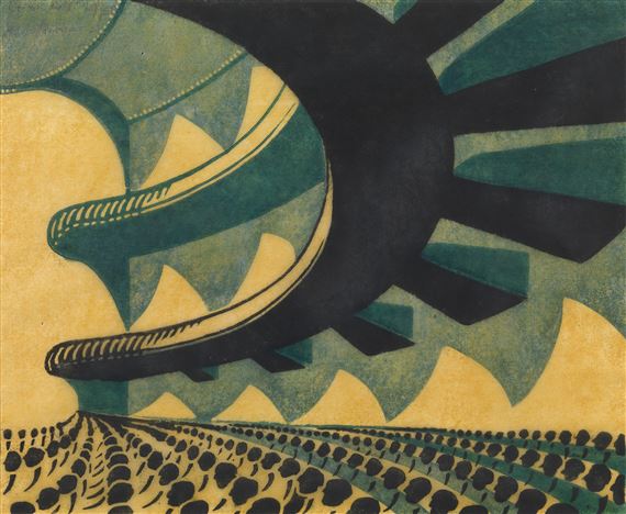 Influences on the Grosvenor School are highlighted at the beginning of the exhibition. Of course, the bleak vistas of Paul Nash’s warscapes, their monochromes and their geometries, are a powerful precedent, as are the advances in the expressive use of color made by David Bomberg. Italian Futurism and the gathering pace of Vorticism in Britain were important contributors to the aesthetic sensibilities of the new mechanical age of Modernism at large. But, as the exhibition makes clear, the driving force behind this brief but bright moment in modern British art-history is Claude Flight’s “dearly held ambitions for the linocut to become the medium to empower the general public to appreciate, own and practise art themselves.”