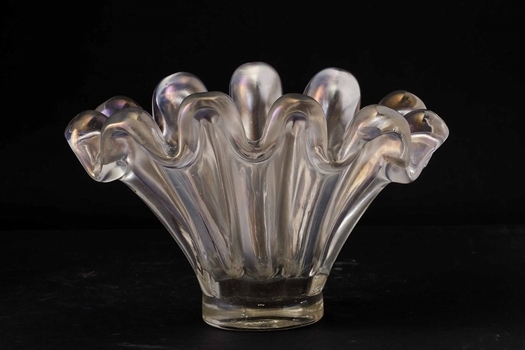 A fan-shaped vase from the A Grosse Costolature series, heavy blown glass with a decor of applications and a fully iridised surface