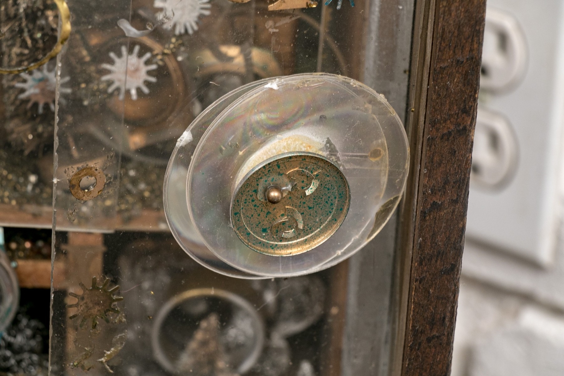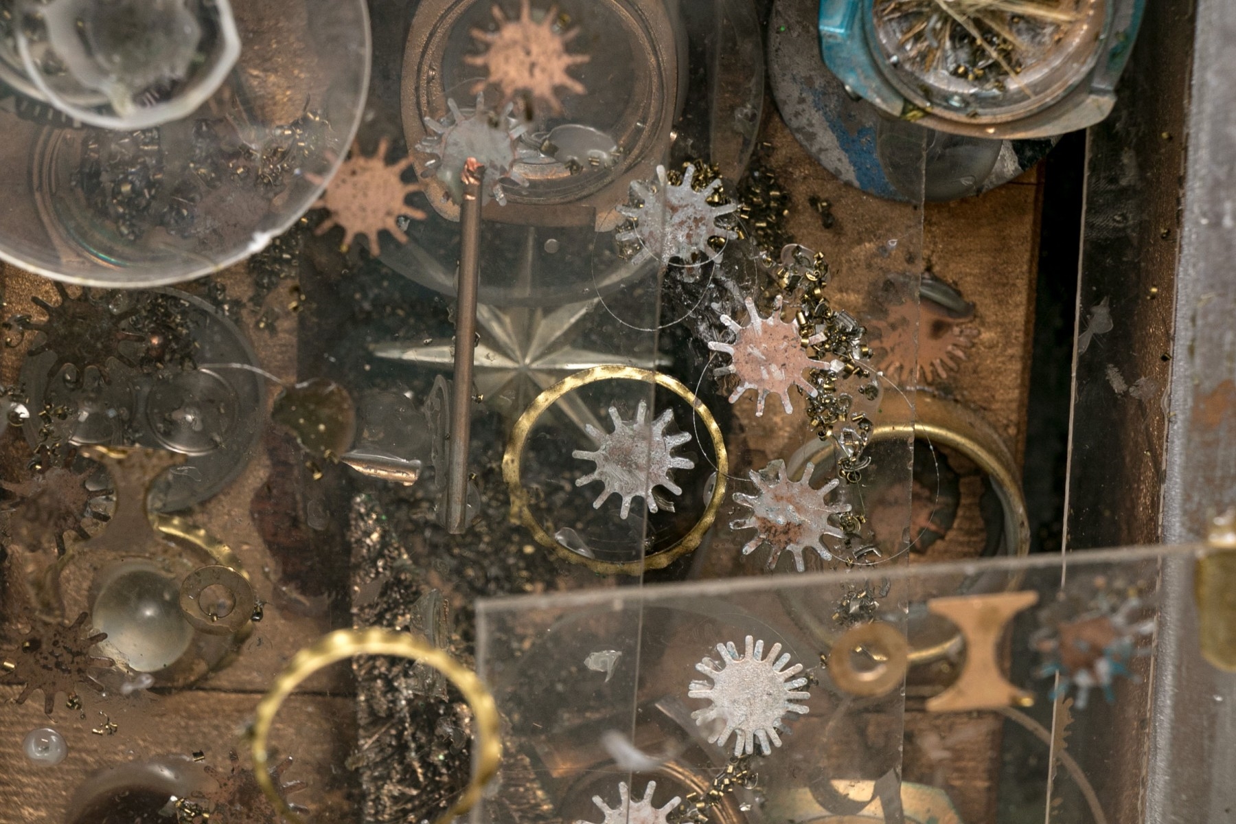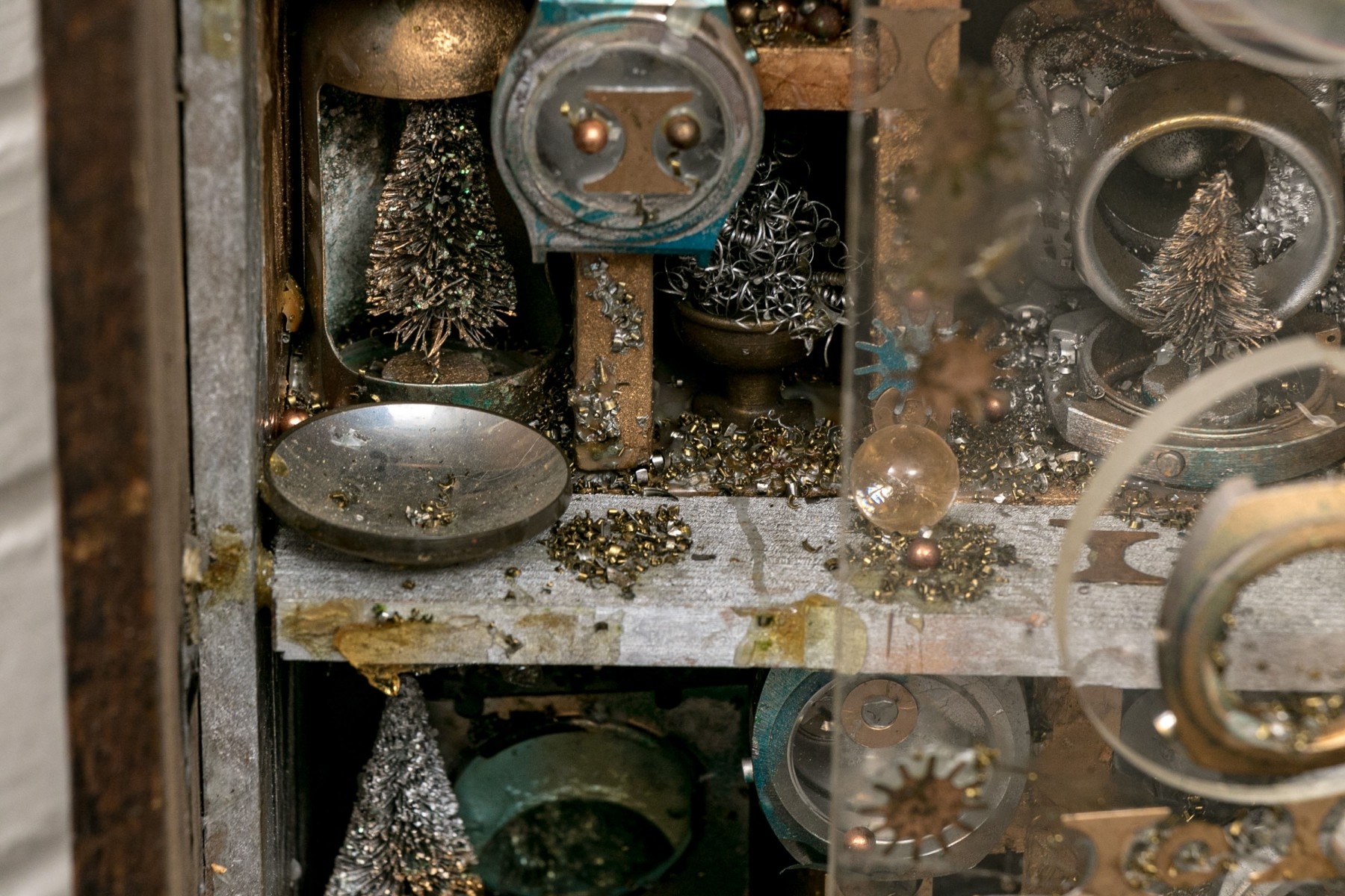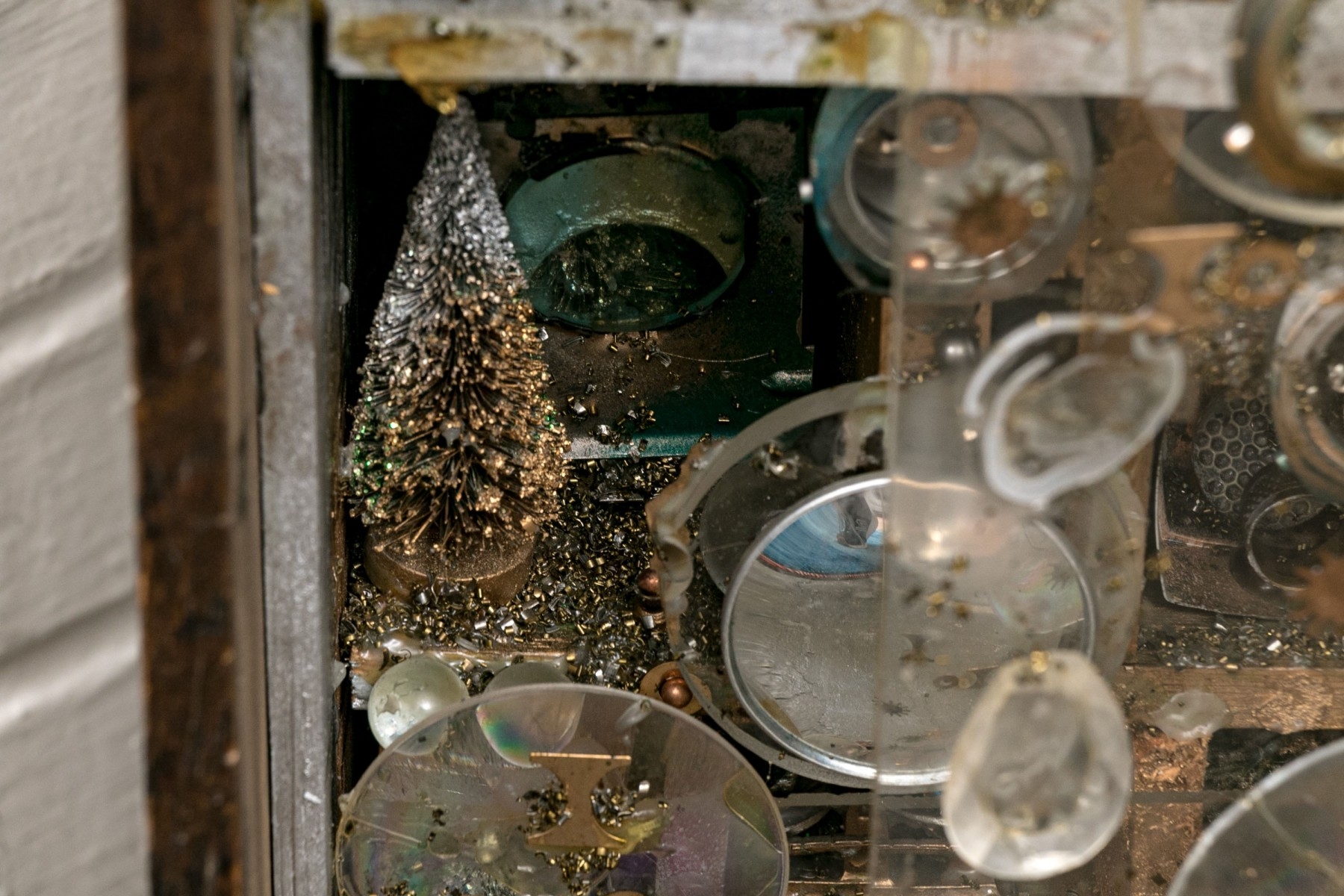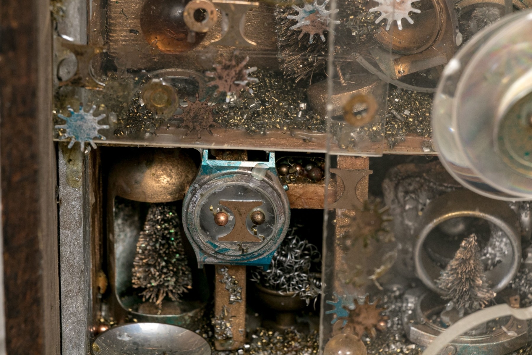wood box construction, glass, printed paper collage, plastic, wood shavings
