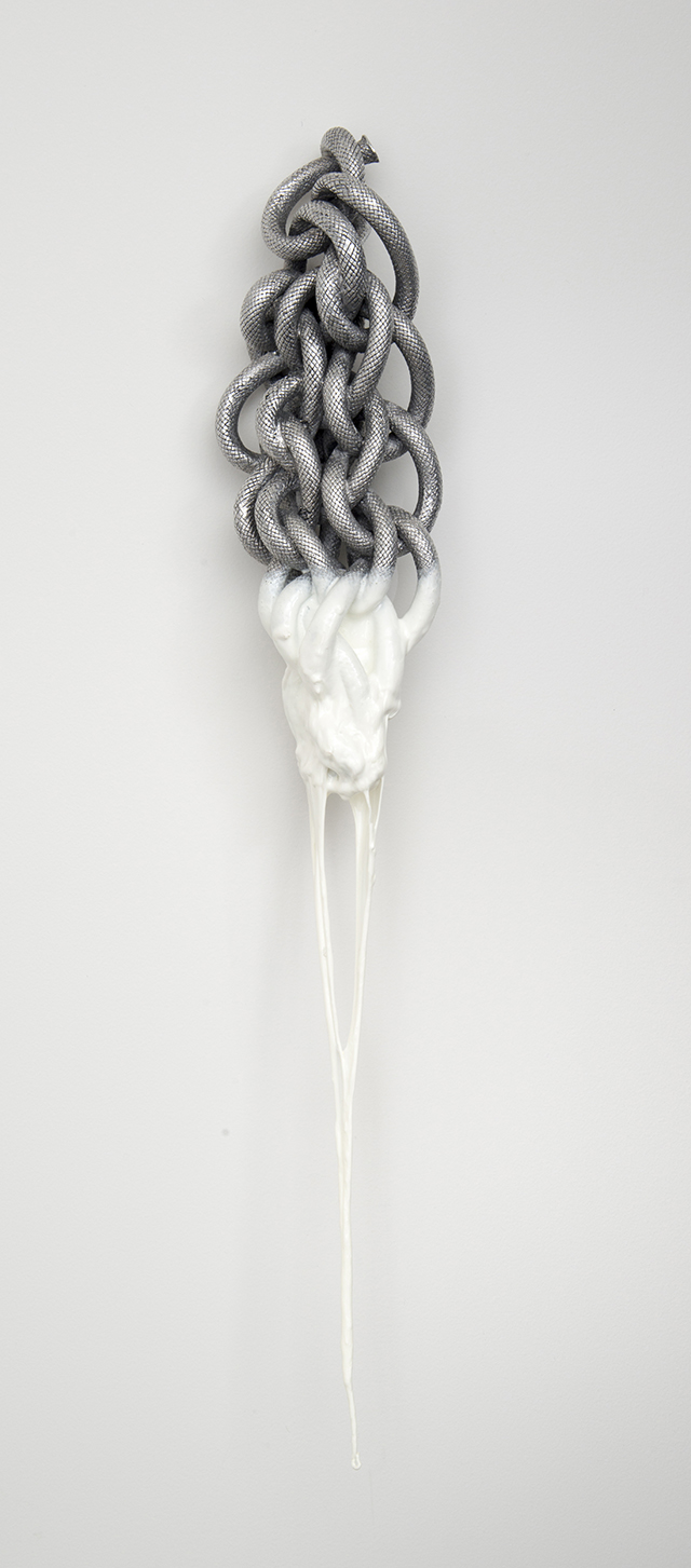 Orly Genger is best known for her large-scale, and often site-specific, installations in which she uses large amounts of recycled climbing and lobster-fishing rope. It was precisely during the process of creation of one of these works for New York’s Madison Square Park in 2011, that the artist conceived a new direction in her practice by transferring the aesthetics of these monumental sculptures to a series of cast sculptures of a domestic scale. Untitled stands out within this series of artworks as a rare example. Whilst the majority of these sculptures are cast in metal, this particular work has been enriched by contrasting the solid and shining aluminum with the paleness and softness of a white resin in which it has been dipped. Reflecting on this series of sculptures, Genger herself has referred to each of the works as a “gesture and a drawing” therefore highlighting the role of her own intuition in the process of creation.