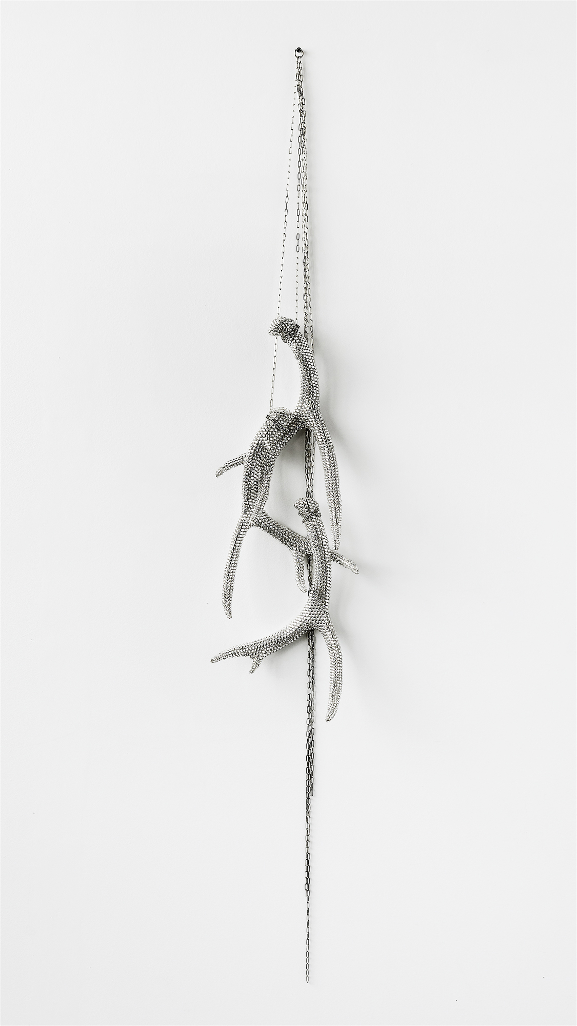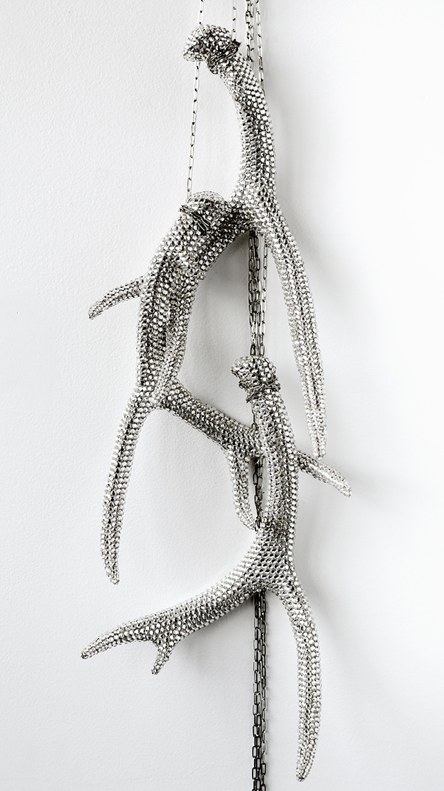 Executed in 2012, Mark Swanson’s Untitled (Crystal Antler Trio) consists of a set of three crystal encrusted deer antlers interlocked with one another in which each antler hangs from a delicate metal chain coiled around the base of the antler. The juxtaposition of the naturally-shed antlers with crystals and silver chains in this piece is characteristic of Swanson’s ouevre. This stylish juxtaposition of crystals and stag heads stems largely from the artist’s personal history as a means of exploring the duality of identities he experienced in his childhood in a small New England town as the son of an ex-marine and devoted hunter and during his experience as a member of San Francisco’s gay community.